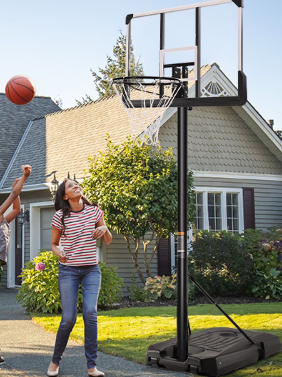 The basketball hoop has 44 inches polycarbonate edge protection design backboard, shock-absorbing bumper. What's more, the basketball hoop has multiple screws to fix the backboard and a rust-proof main shaft, to ensure the basketball goal is more durable and sturdy to use indoor and outdoor.