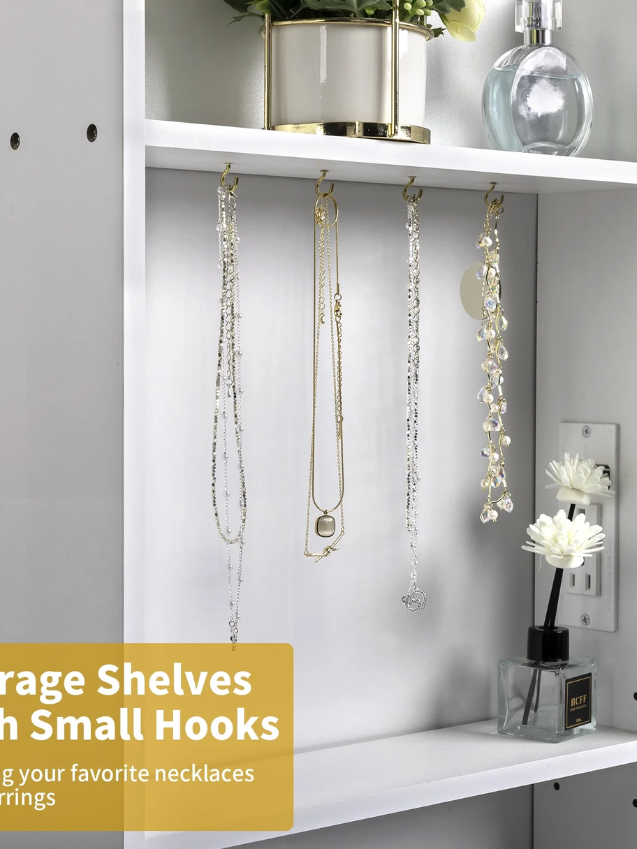 The hooks on the storage shelf for hanging your necklaces and earrings