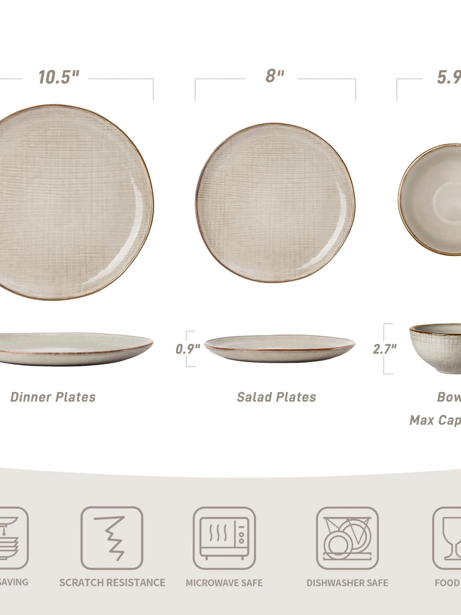 Moonlight Plates and Bowls Sets, 12 Piece Stoneware Dinnerware Set with Linen Fi