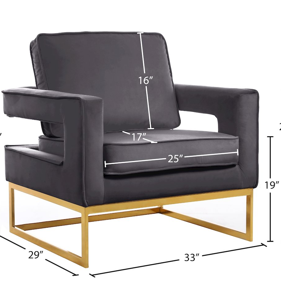 Kick back and relax in style with this eye-catching Noah grey velvet accent chair. Featuring a unique, sleek modern design, this chair's grey velvet upholstery and gold stainless steel base is both plush and durable. The chair's cushion is padded with high-density foam, ensuring absolute comfort while you sit and read or watch TV.