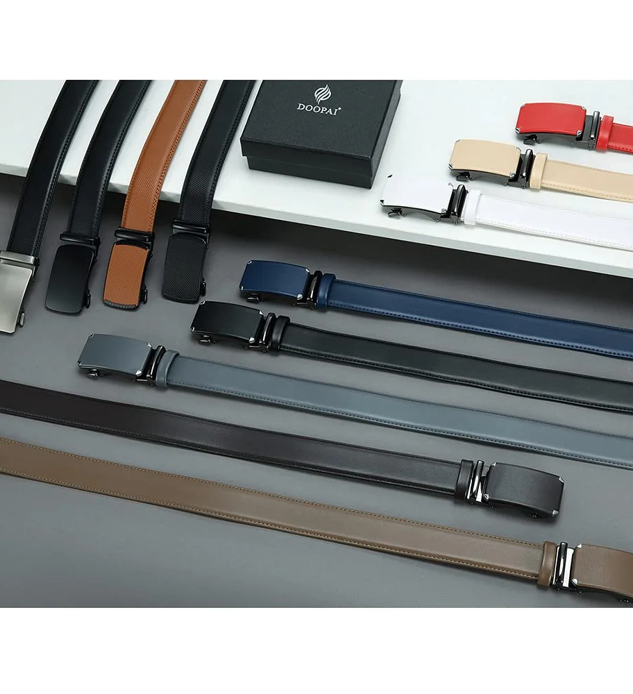 - Great Quality Leather Our men's ratchet belt is made of high-quality leather and features great special craftsmanship for long-lasting wear. The belt buckle is plated with a high-strength alloy, which makes it scratch-resistant and durable.