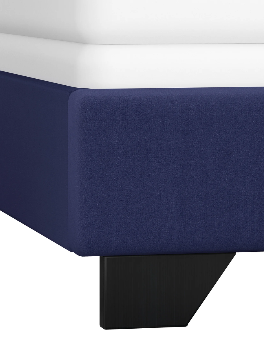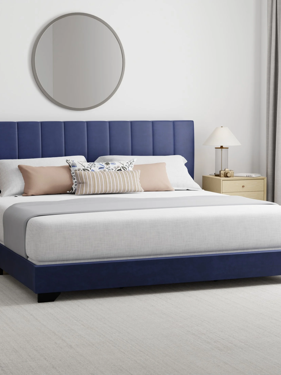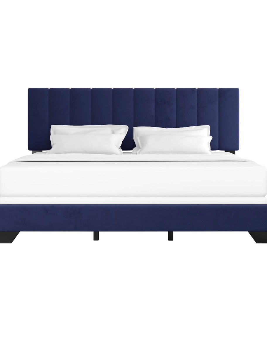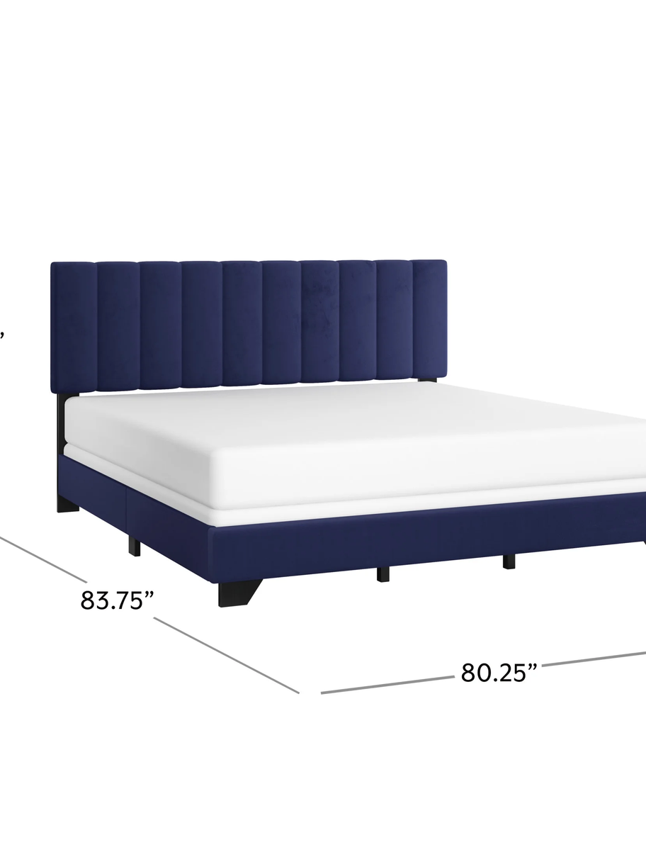 At once comfortable and sophisticated, this channel-tufted king bed strikes a flawless balance. Indulge your senses with this beautifully designed piece that celebrates everyday luxury with its clean, elegant lines and dreamy faux velvet upholstery. A modern low profile grounds the frame, while the vertical tufting seems to elongate the headboard. This adult bed is fully enveloped in a chic sapphire blue, and the legs feature a black finish for an attractive contrast. Box spring and mattress required; not included. Assembly required.