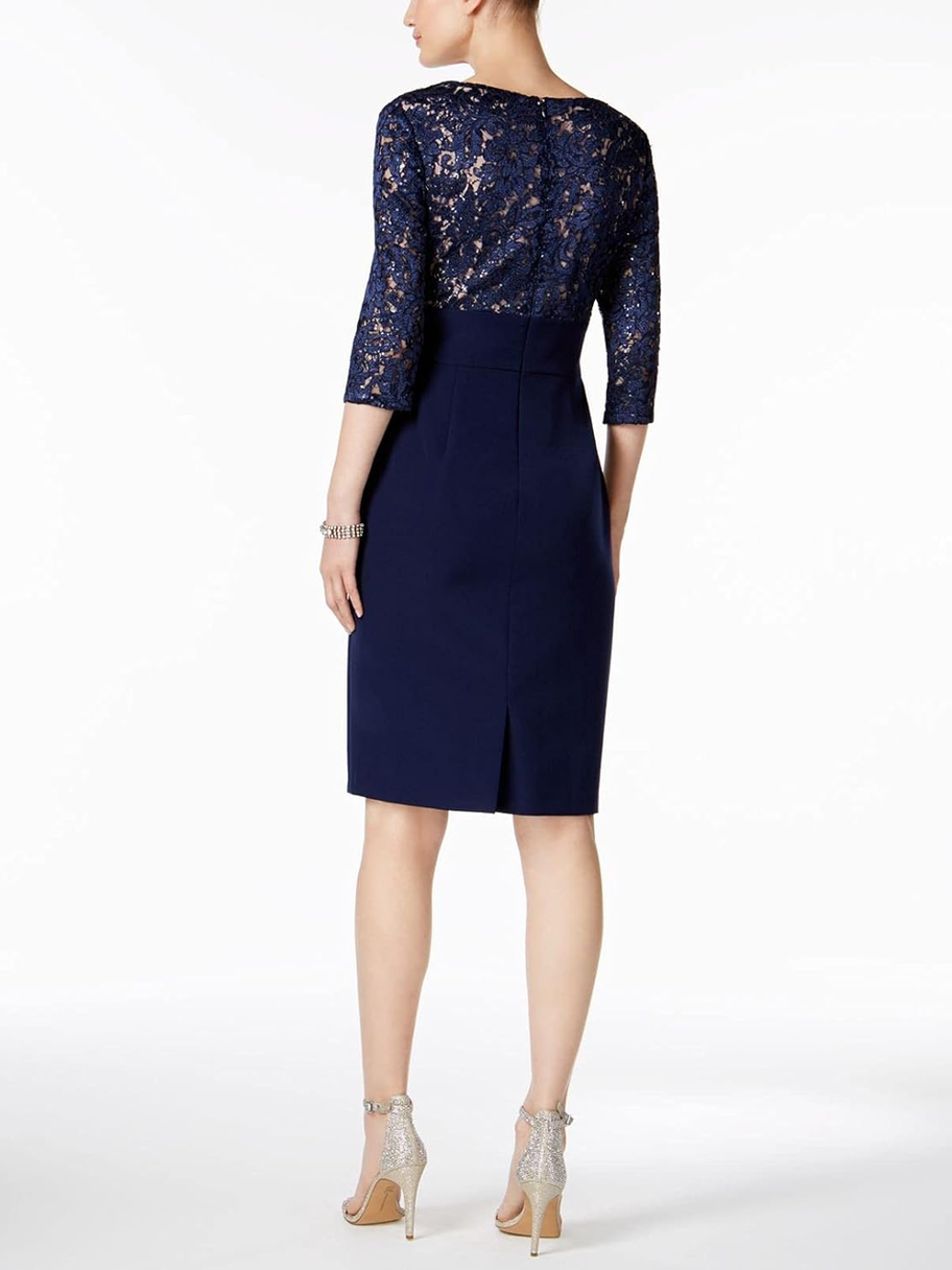 Our gorgeous short, faux wrap sequin lace bodice dress features 3/4 illusion sleeves, scalloped details along the neckline, and a front tie belt. This classic dress is perfect for a mother of the bride or groom, guest of wedding or for any special evening event.